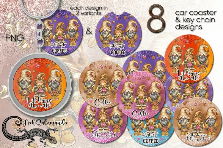Create amazing sublimation crafts with beautiful Coffee Gnome | 8 Car coaster & key chain Christmas designs, PNG. Here is set of 8 designs, each design comes in 2 files, car coaster and a round one. You can add your own text or just use it as a ready-made design.