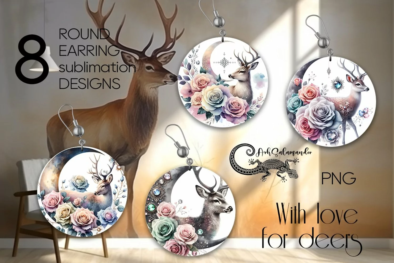 Create amazing sublimation crafts with beautiful Deer, moon & Flowers | 8 Round earring Sublimation designs, PNG