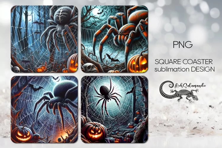 Create amazing sublimation crafts with beautiful Halloween spider | 4 funny square coaster sublimation design, PNG. Here is set of 4 square coaster designs, PNG.