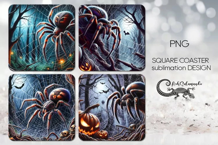Create amazing sublimation crafts with beautiful Halloween spider | 4 funny square coaster sublimation design, PNG. Here is set of 4 square coaster designs, PNG.