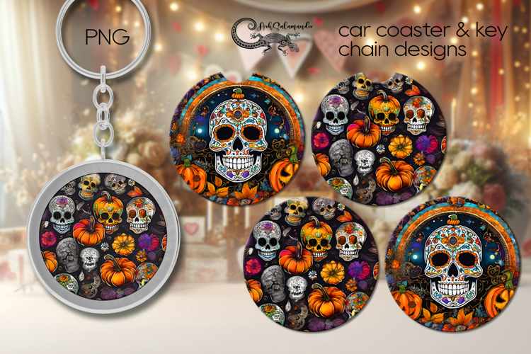 Similar Design Products to Sugar Skulls | Halloween Car coaster & key chain designs PL3