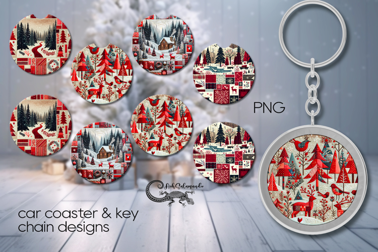 Xmas patchwork landscape | 4 Car coaster & 4 key chain example image 1