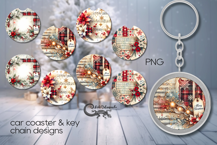 Vintage Christmas | 4 Car coaster & 4 key chain designs example image 1