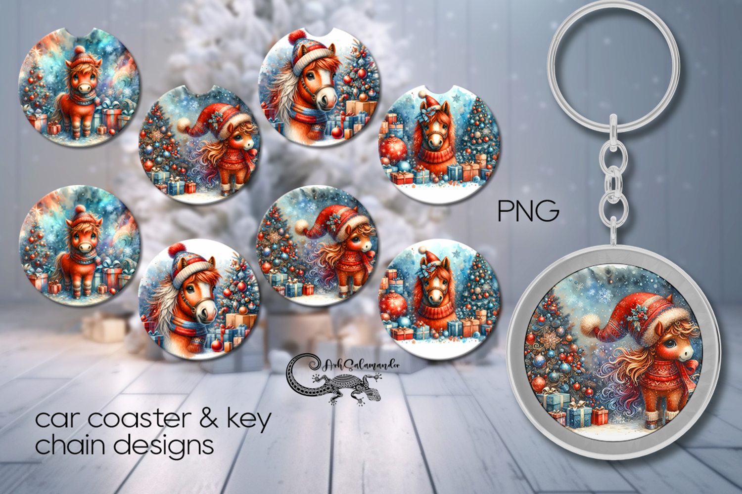 Christmas horse | 4 xmas Car coaster & 4 key chain designs P