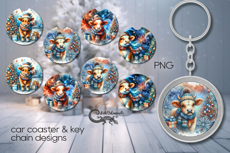 Christmas cow | 4 xmas Car coaster & 4 key chain designs P example image 1