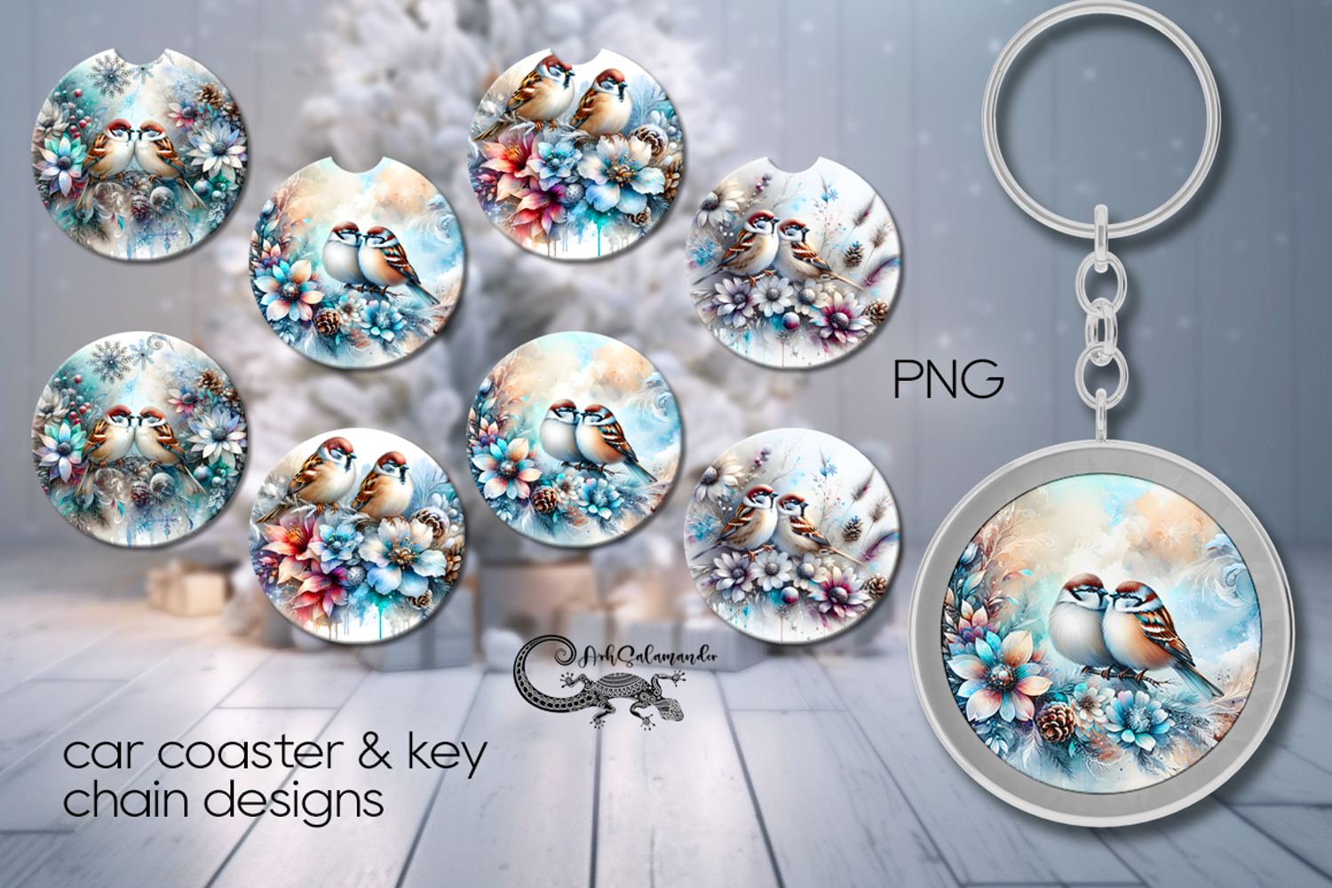 Christmas birds | 4 xmas Car coaster & 4 key chain design