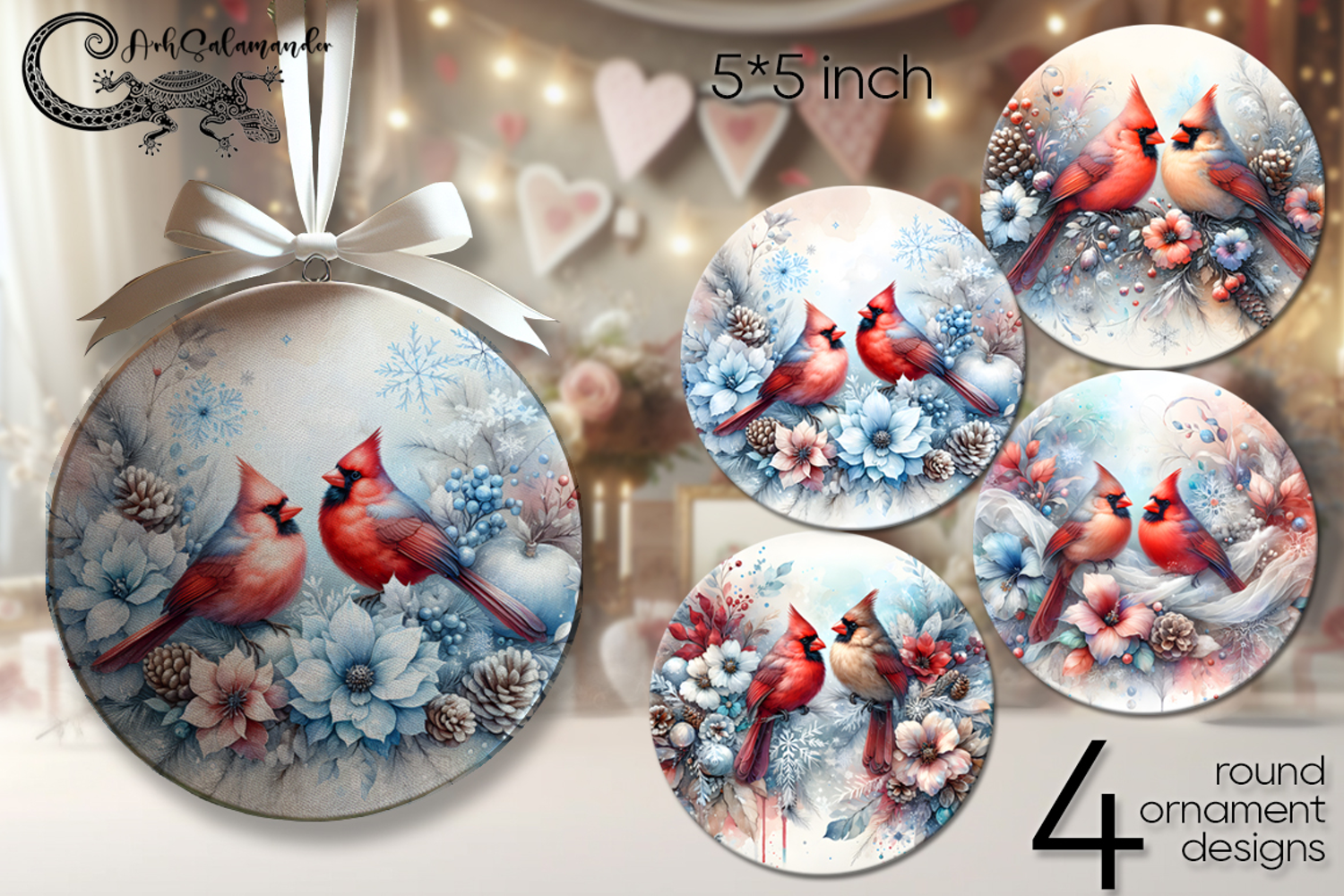 Christmas Cardinal | 4 round ornaments sublimation designs example image 1