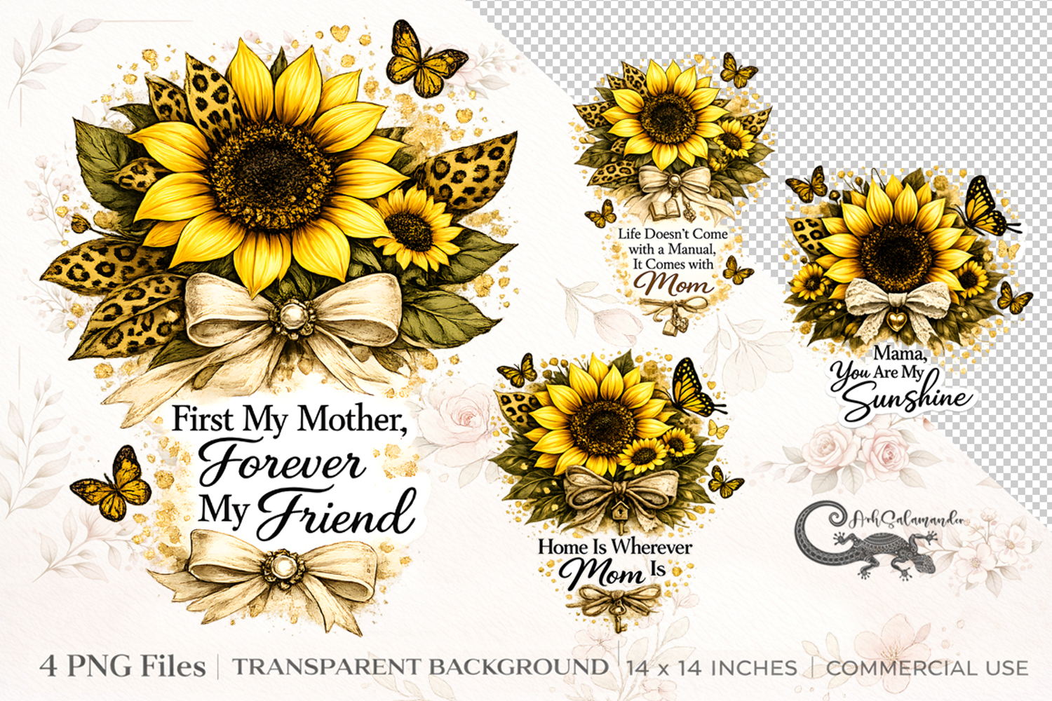 A beautiful 4-piece sunflower motherhood clipart collection featuring elegant floral compositions, uplifting mom quotes, butterflies, golden accents, and stylish leopard print details. Designed in a clean digital clipart style with crisp edges, rich warm tones, and transparent backgrounds, these high-quality PNG sublimation designs are perfect for t-shirts, mugs, tumblers, signs, cards, stickers, and heartfelt Mother’s Day gifts.sunflower mom clipart