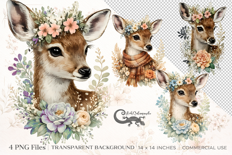Create charming woodland magic in your projects with this beautiful deer watercolor clipart set. This collection includes 4 high-quality PNG sublimation designs featuring adorable deer portraits with floral crowns, soft botanical details, and elegant seasonal accents in a cohesive hand-painted style. Perfect for sublimation, nursery decor, baby shower designs, stickers, invitations, mugs, shirts, cards, and other print-on-demand creations. Each design is detailed, clean, and ready to use for beautiful nature-inspired products.