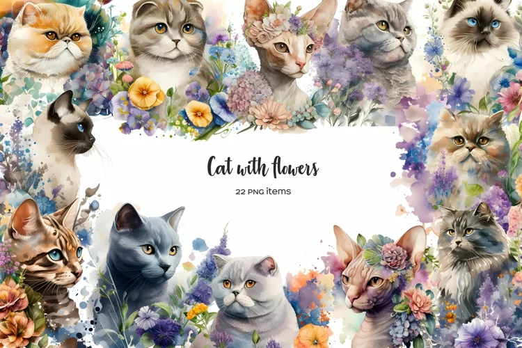 Watercolor cat breeds clipart. Cats with flowers clip art example image 1