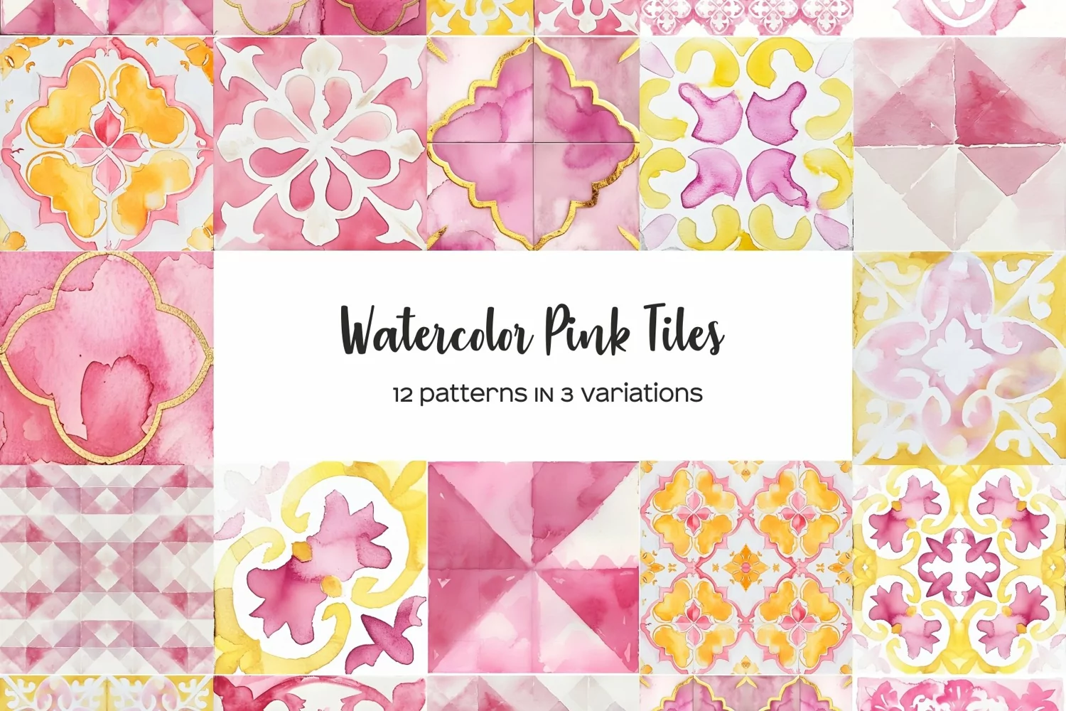 Watercolor 36 tiles clipart. Pink, yellow and gold tiles