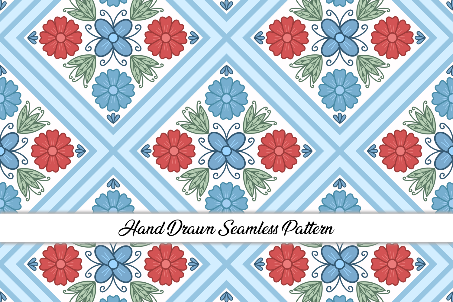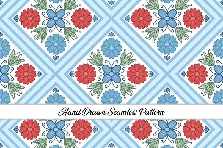 A seamless geometric pattern of diamond shapes filled with stylized floral motifs in soft blue, red, and green tones., creating a sweet and playful design perfect for Wallpaper, wrapping paper, stationery, and romantic craft projects.