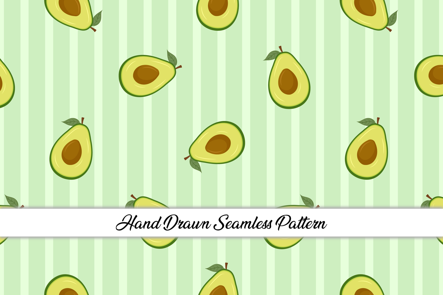 This adorable avocado seamless pattern Featuring charming, hand drawn style avocado halves with their perfect brown pits and tiny green leaves, this design is set against a soft, pastel light green striped background