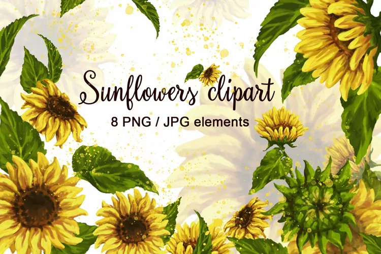 A set of flowers and leaves of a sunflower for the summer, cozy patterns for fabrics, cards, invitations, kitchenware and more.