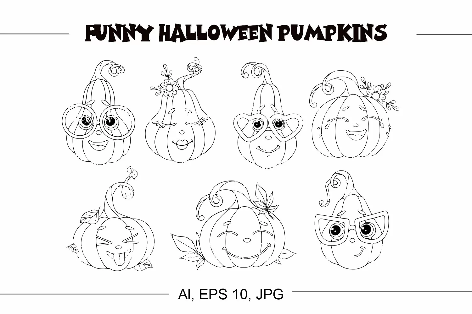 A set of sketches, doodles, coloring books of funny carved Halloween pumpkin characters. Funny pumpkins for decoration and decor of the autumn holidays, simple minimalist designs.