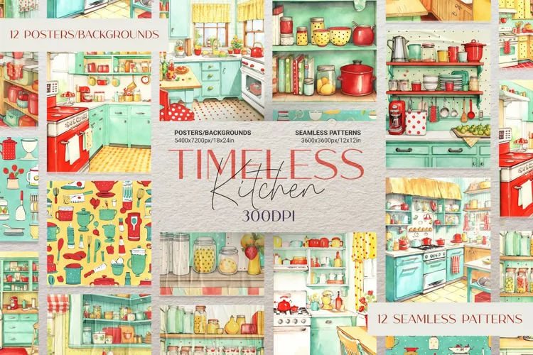 Posters Backgrounds Seamless Patterns Digital Papers Wall Art Retro Backgrounds Junk Journal Vintage Kitchen Journal Pages Retro Kitchen