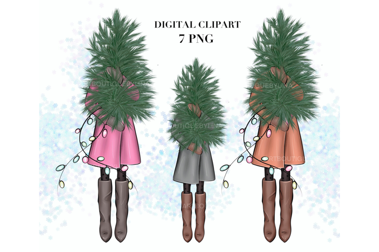 This elegant winter-themed clipart set features stylish women holding Christmas trees in festive outfits. Perfect for holiday stickers, planners, sublimation designs, greeting cards, print-on-demand, wall art, and DIY gifts.