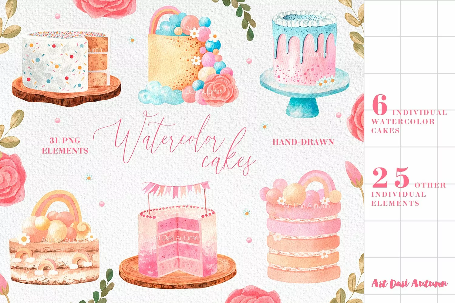 Boho cake clipart, Watercolor birthday cake PNG set example image 1