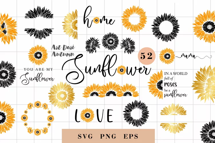 - 19 designs with sunflowers in PNG, SVG and 1 sheet with 19 elements in EPS