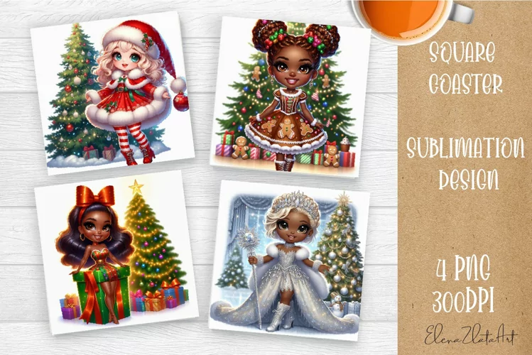 Christmas tree and girl Square Coaster Sublimation Design example image 1