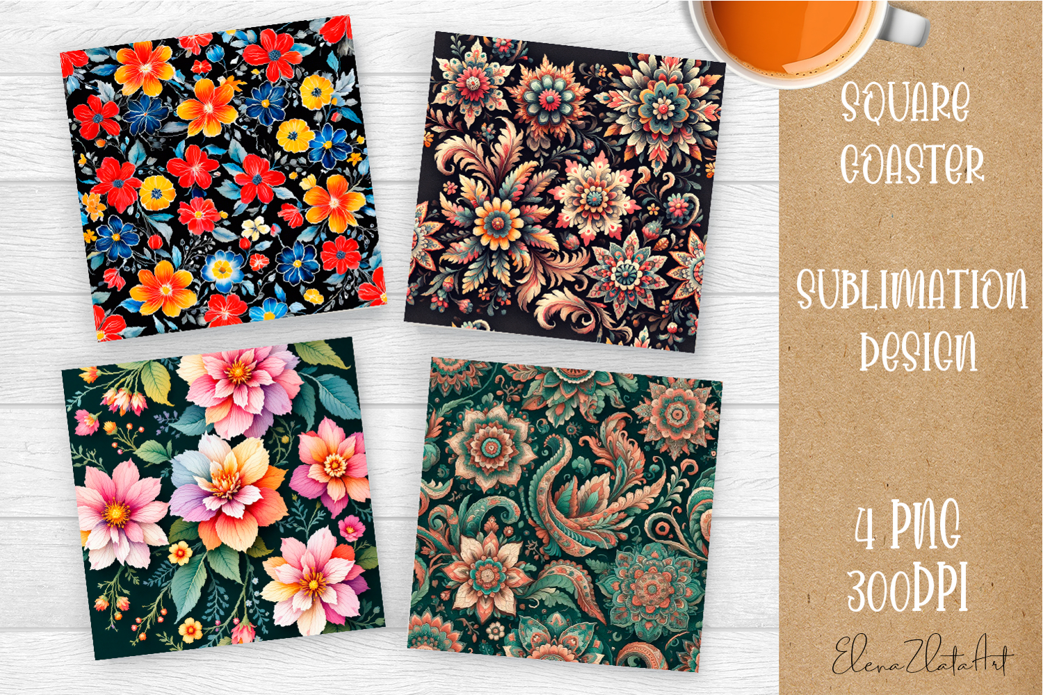Folk flowers tile Coaster Design, Summer Coaster