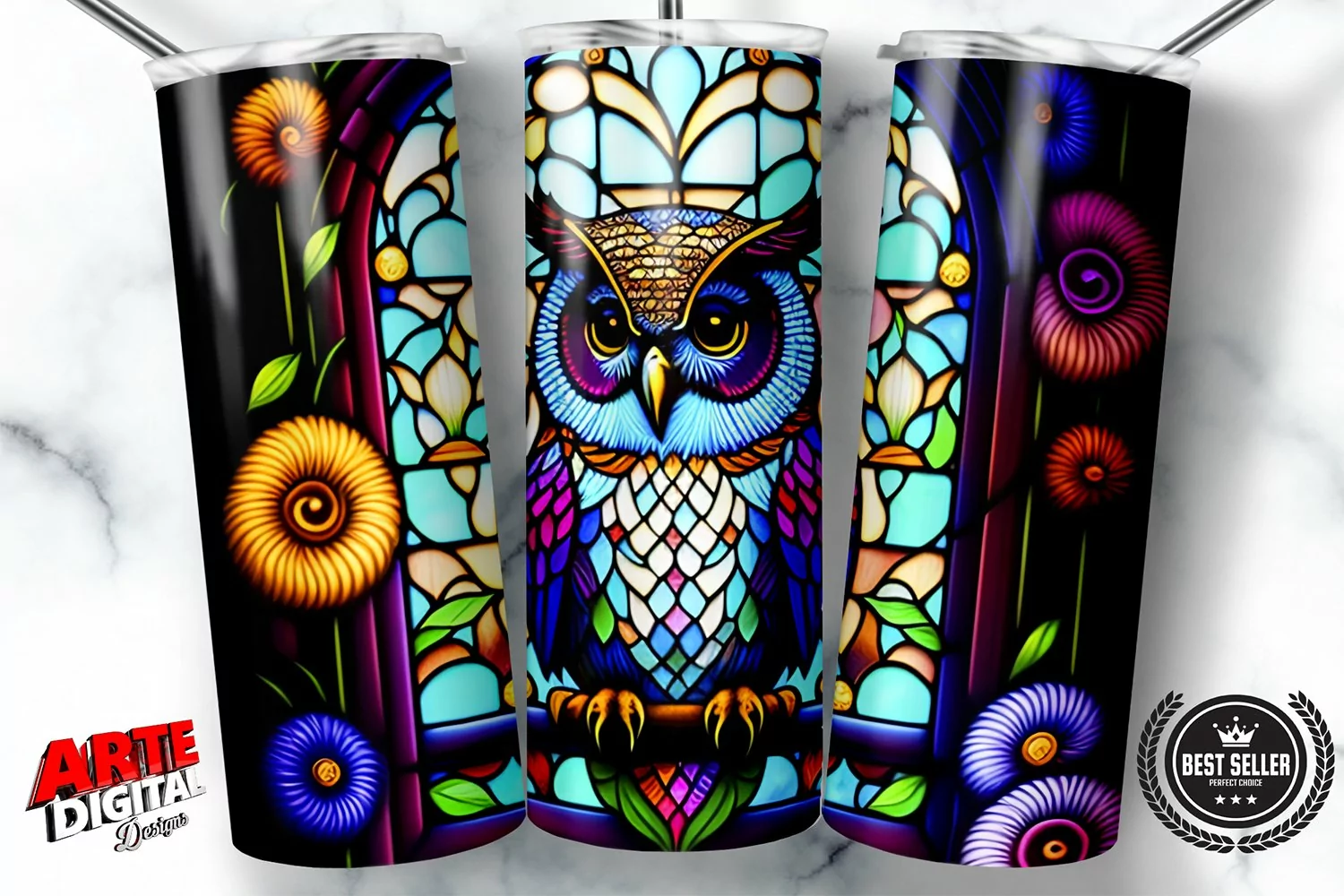 Owl Stained Glass 20 oz Skinny Tumbler Sublimation Design, Instant Digital Download PNG, Straight & Tapered Tumbler Wrap PNG