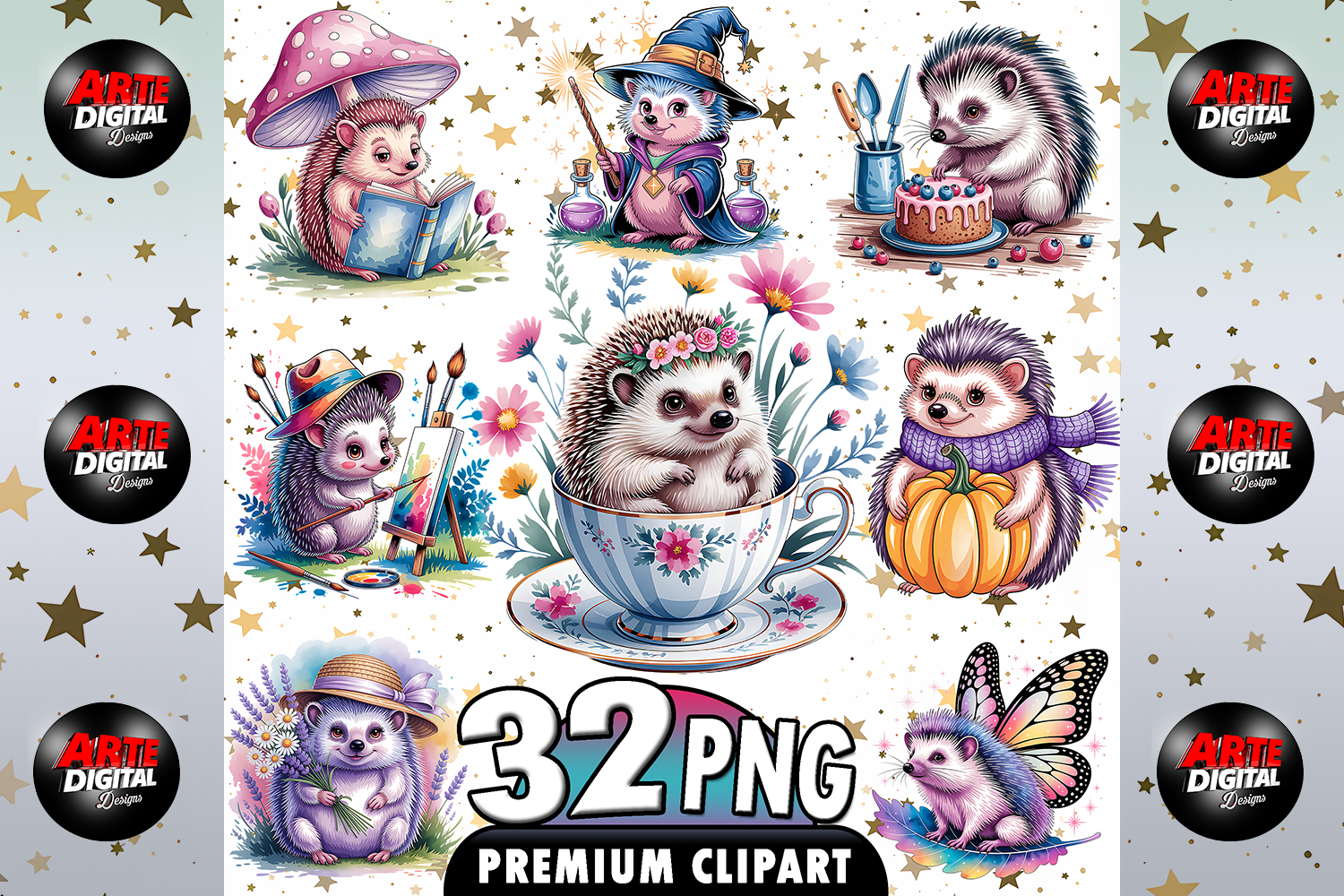 This digital collection includes 32 unique PNG illustrations featuring cute hedgehogs in whimsical scenes — perfect for adding a soft woodland touch to your creative projects. Each image is beautifully hand-painted in watercolor style and comes with a transparent background for effortless use.