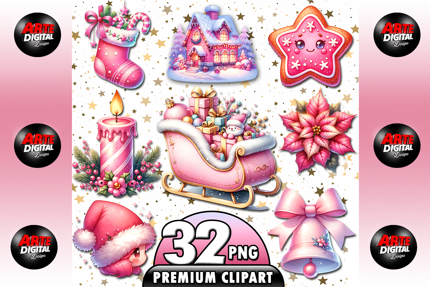 ✨ Pink Christmas Watercolor Clipart Bundle – 32 High-Quality PNGs