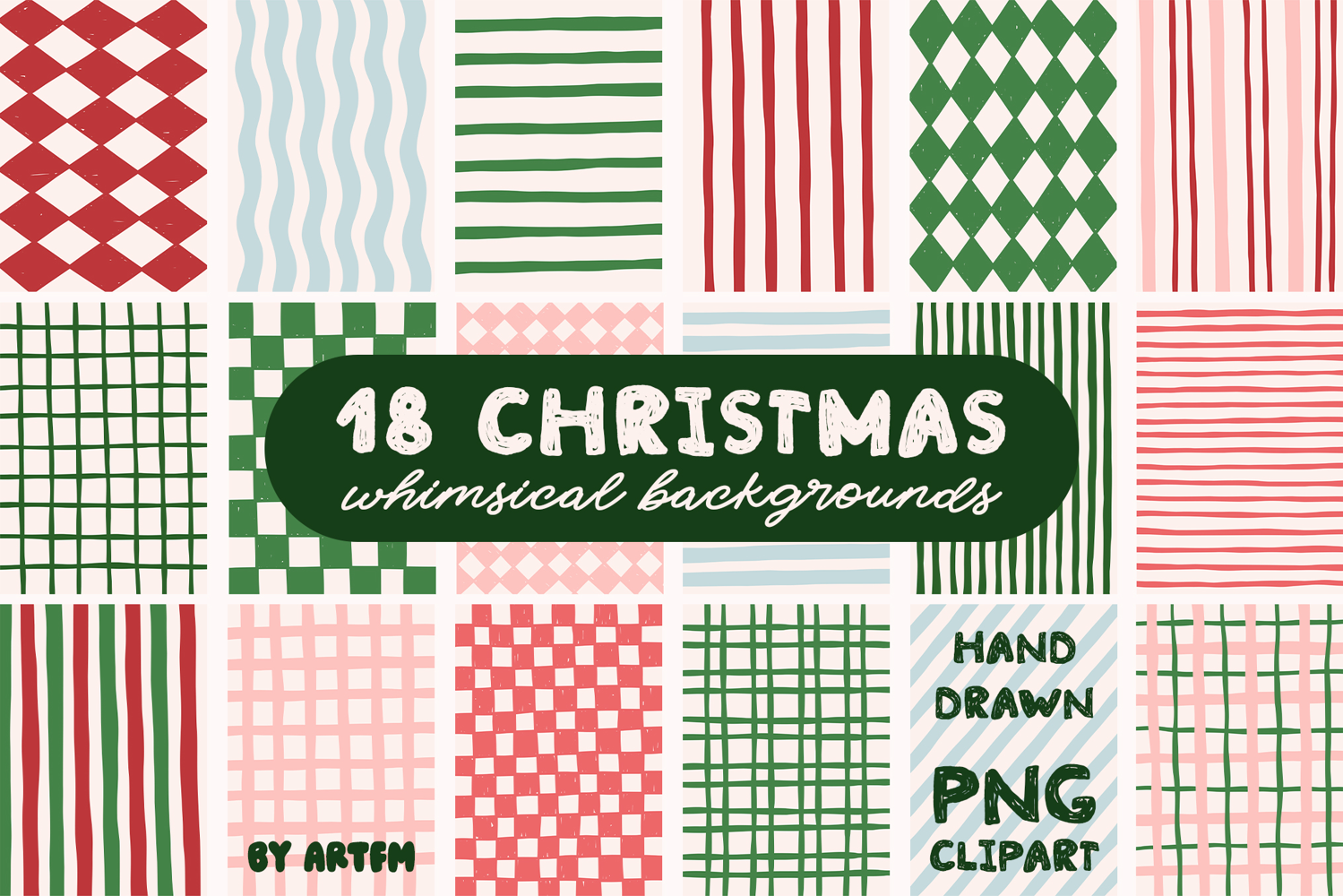 A cozy set of 18 hand-drawn Christmas backgrounds featuring whimsical striped and checkered patterns in a retro, vintage-inspired style. Perfect for holiday cards, posters, packaging, wrapping paper, branding, scrapbooking, and digital projects. Supplied in high-quality formats, ready for print and digital use.
