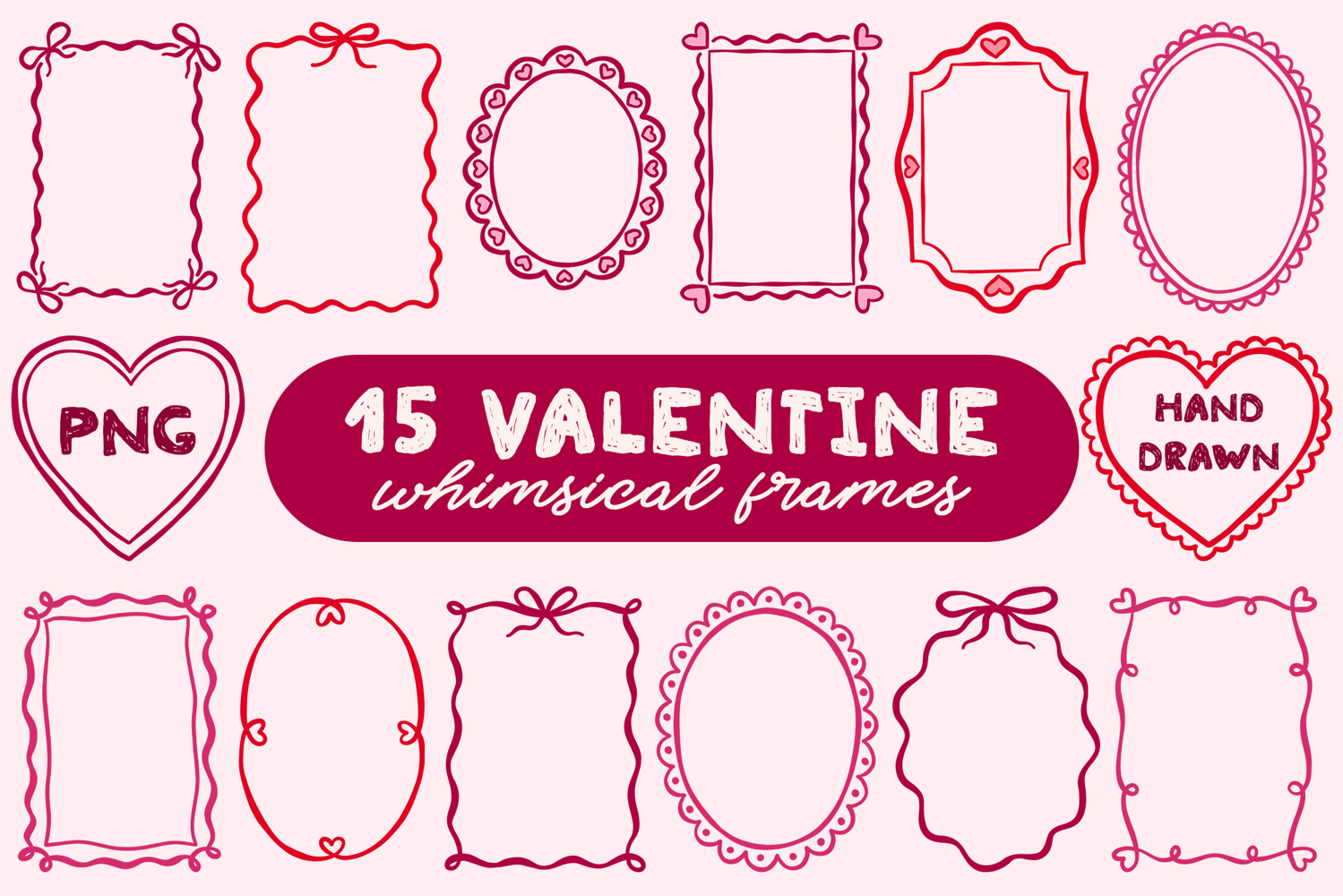 This set includes 15 hand drawn Valentine frames in a whimsical coquette and romantic style.