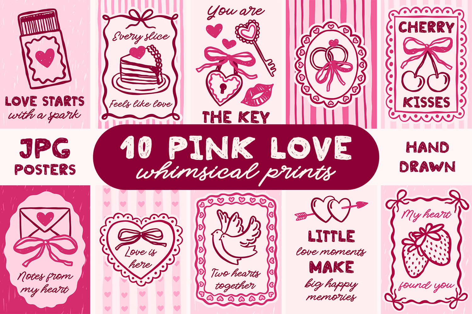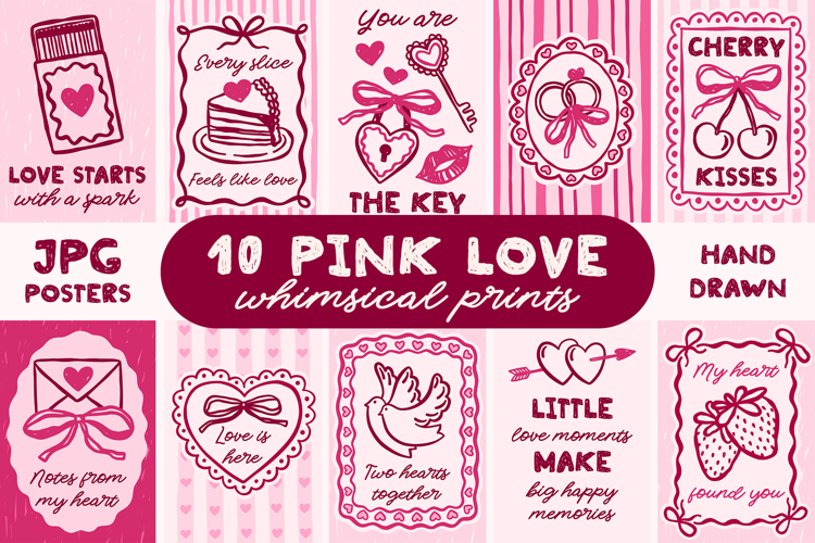 This romantic printable art set includes 10 hand drawn pink love designs in a whimsical, coquette and feminine style.