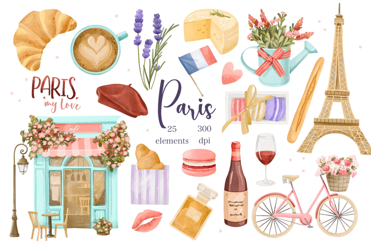 Bring a touch of Parisian charm to your designs with this hand-painted watercolor clipart pack.