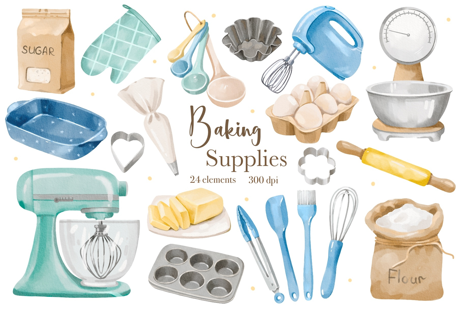 Watercolor Baking Supplies Clipart Set, Kitchen Utensils PNG