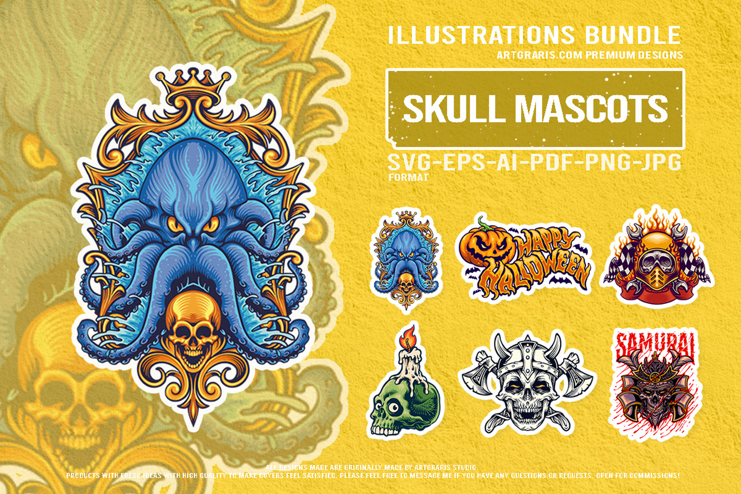 Vector illustration Spooky Samurai Skull Halloween Mask Pumpkin Horror Set suitable for various purposes, such as Illustration on Merchandise T-shirts, Tote Bags, stickers, banners or Decorations, greeting, Postcards, flyers, posters, and other design products.