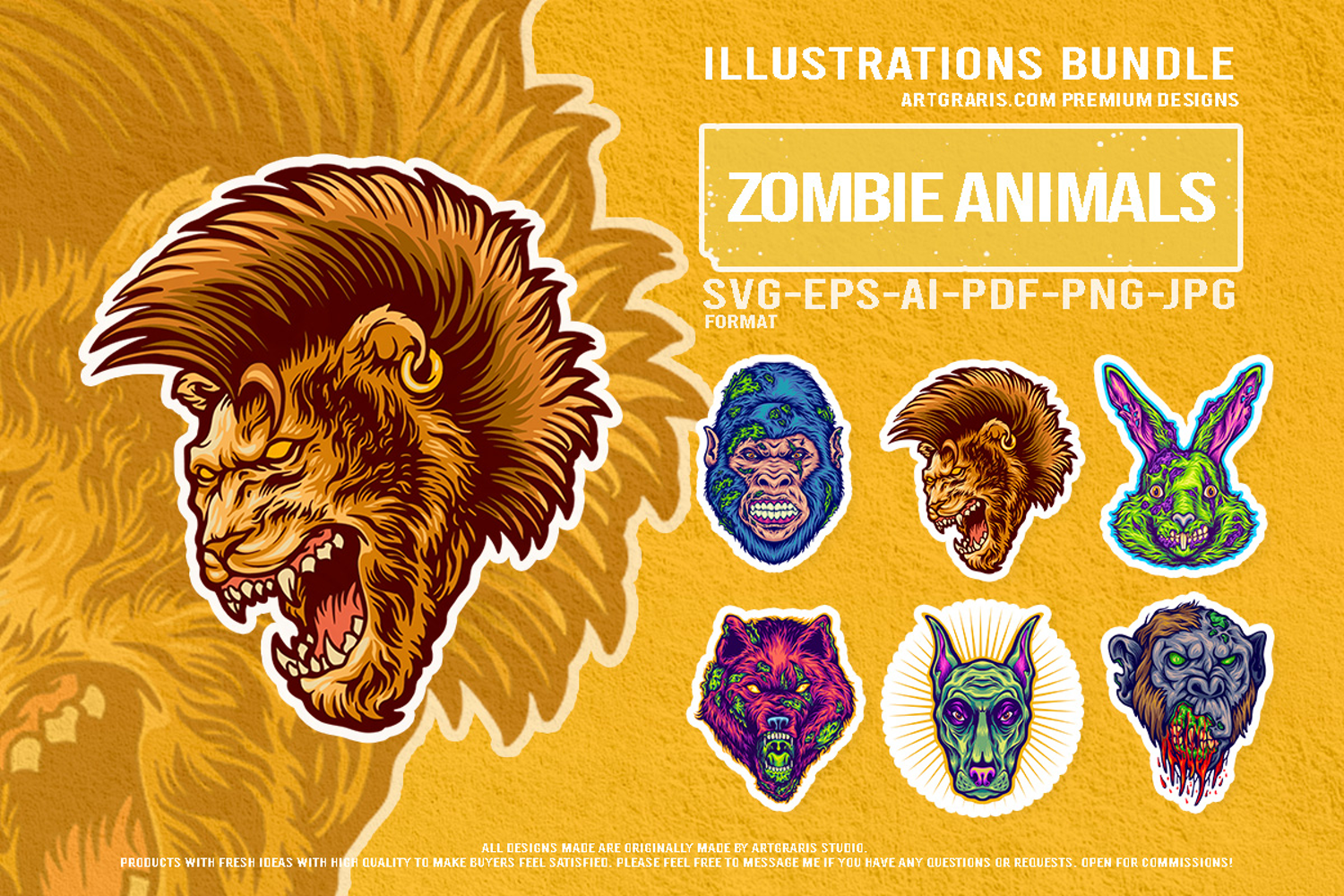 Vector illustration Zombie Animal Heads Horror Beast suitable for various purposes, such as Illustration on Merchandise T-shirts, Tote Bags, stickers, banners or Decorations, greeting, Postcards, flyers, posters, and other design products.