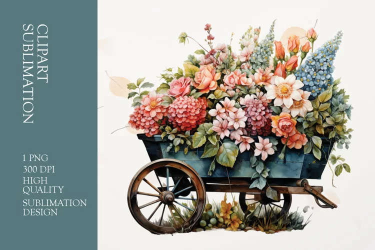 Floral Wheelbarrow Watercolor Clipart Sublimation