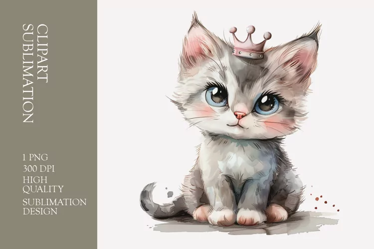 Cute kitten with crown watercolor clipart sublimation example image 1