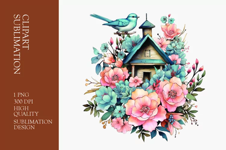 Watercolor floral bird house clipart png example image 1