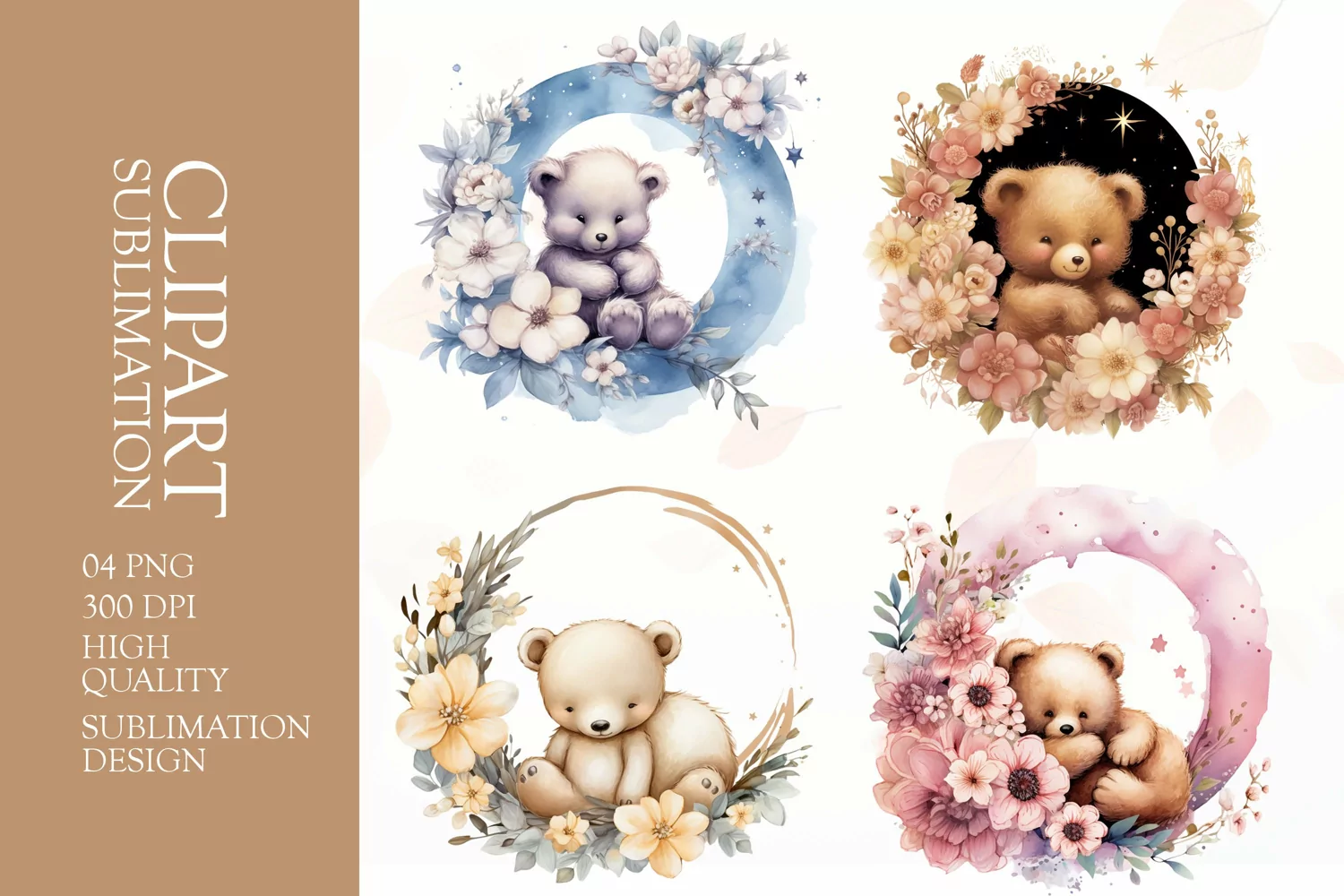 watercolor floral bear clipart sublimation png