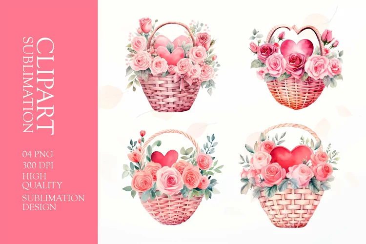 Valentines Day watercolor flower basket Clipart
