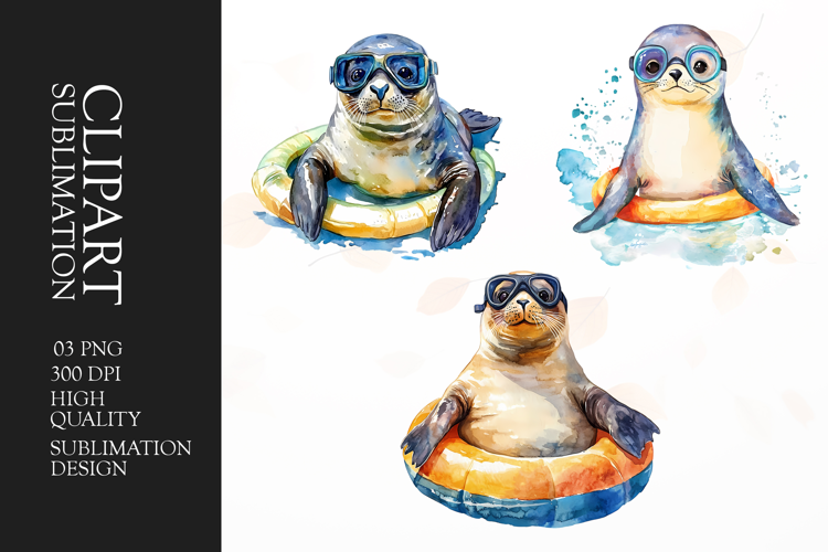 Funny summer seals watercolor clipart sublimation png example image 1