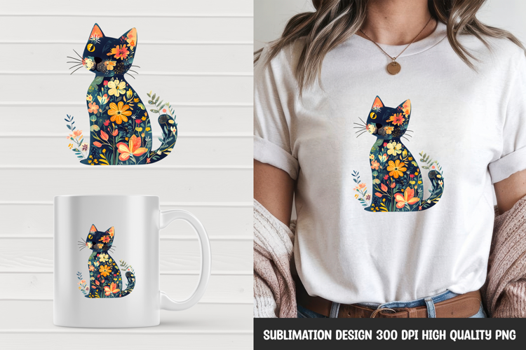 Whimsical Cat with Flower Pattern Clipart Sublimation PNG example image 1
