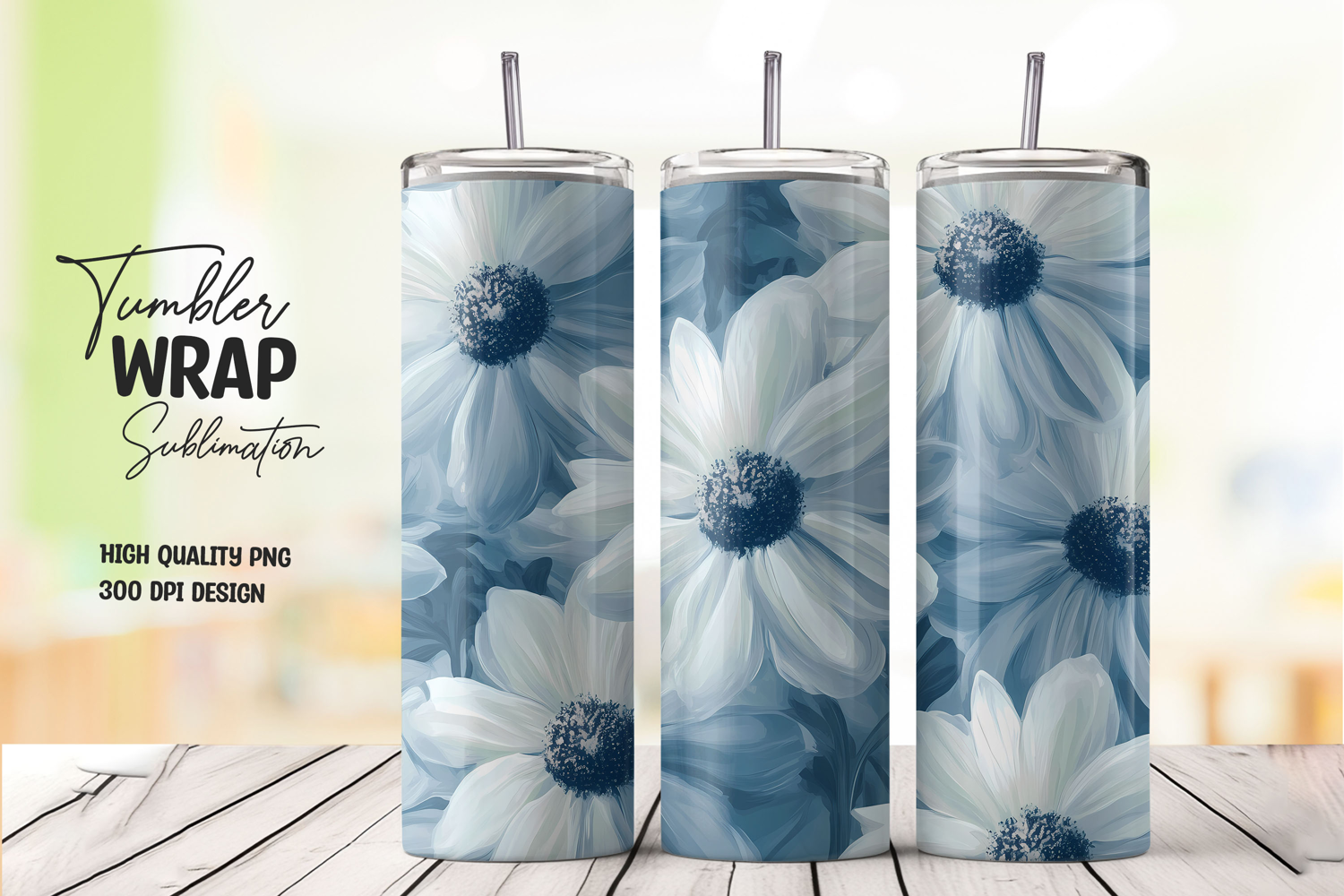 Floral Flower Bloom Blue Png White Daisy Wrap Sublimation Tumbler