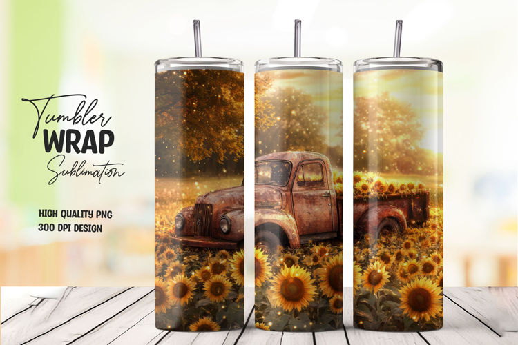 Rustic Golden Scene Truck Hour Countryside Sublimation Tumbler Wrap Png Sunflower