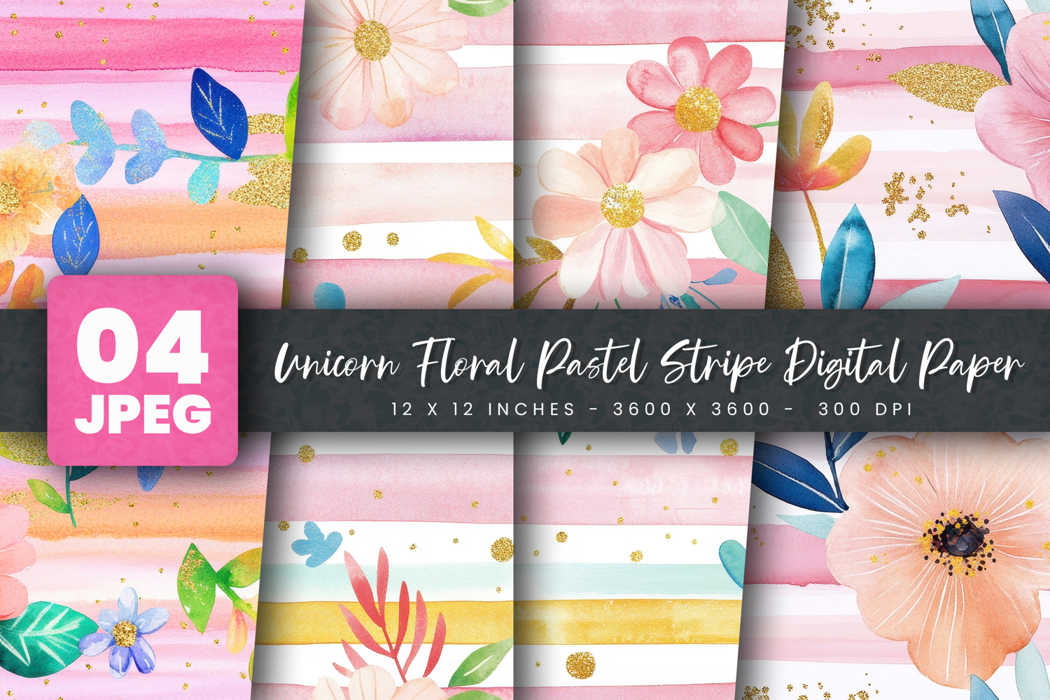 Unicorn Floral Pastel Stripe Digital Paper example image 1