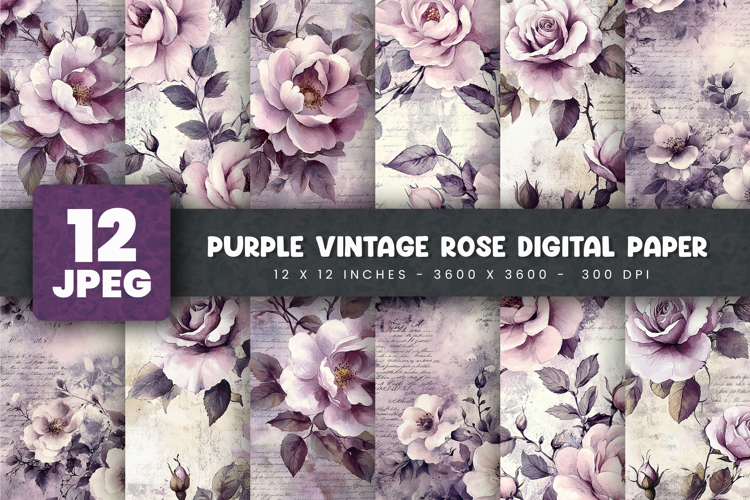12 Purple Vintage Rose Digital Papers Bundle