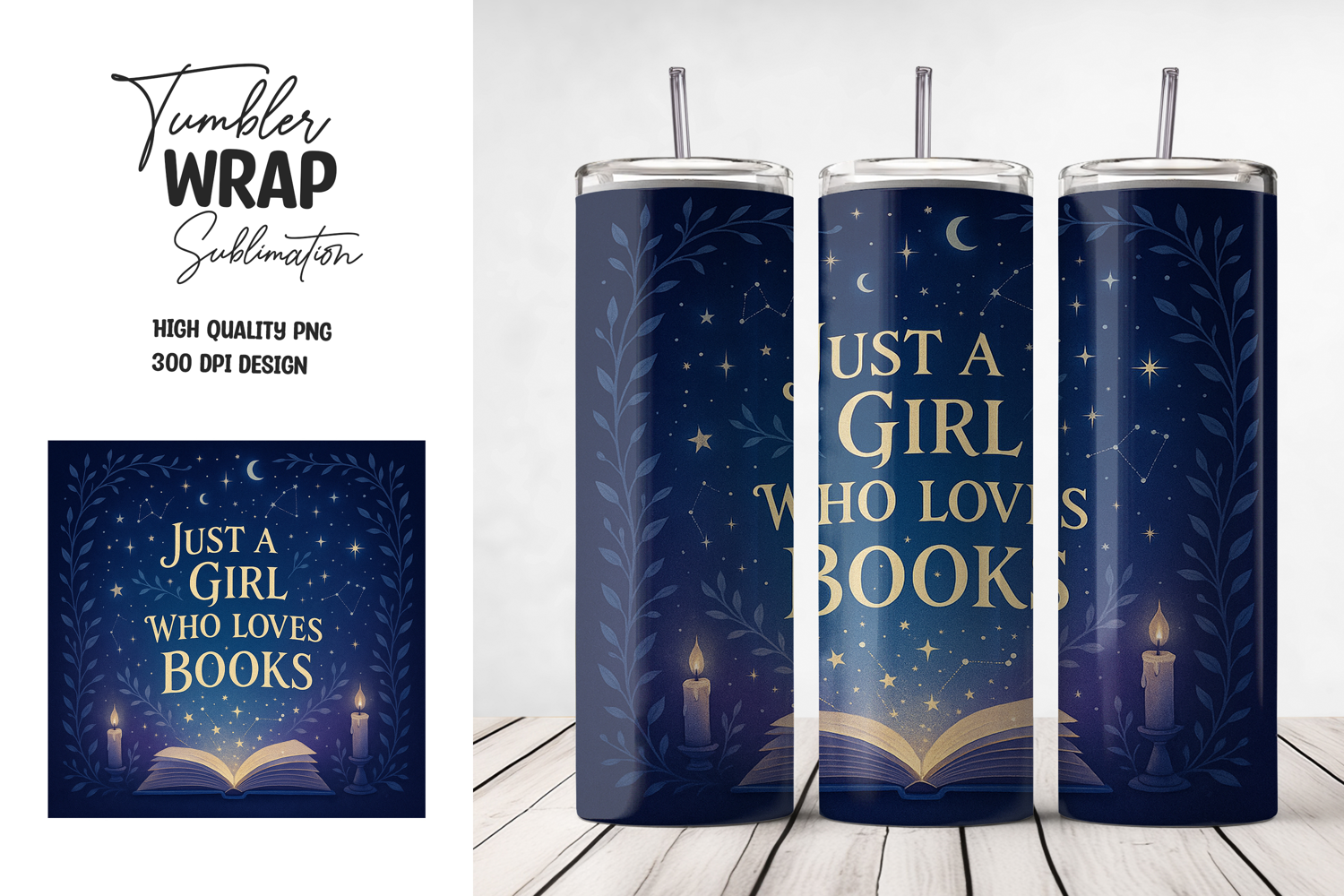 Just A Girl Who Loves Books Book Lover Tumbler Night Sky Tumbler Wrap Moon And Stars Design Magical Book Sublimation Celestial Book Png Galaxy Reading Tumbler Dark Blue Book Wrap Fantasy Reader Tumbler Aesthetic Library Png