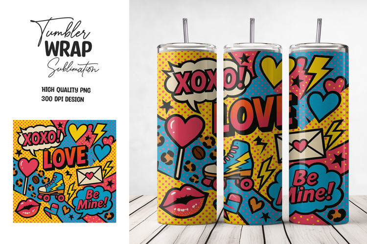 Pop Art Tumbler Wrap Retro Valentine Tumbler Bold Graphic Tumbler Wrap Comic Love Png Xoxo Be Mine Design Colorful Comic Sublimation Cute Heart Roller Skate Art Neon Romantic Drinkware 80s Style Pattern Png Vintage Love Typography