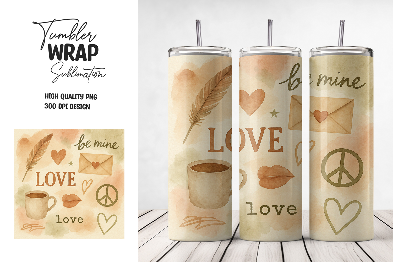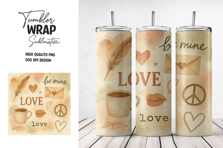 Soft Watercolor Tumbler Wrap Boho Love Tumbler Wrap Neutral Watercolor Png Minimal Valentine Design Peace Symbol Art Wrap Rustic Coffee Cup Tumbler Beige Romantic Sublimation Hand Drawn Love Icons Warm Earthy Tones Png Bohemian Valentine Tumbler