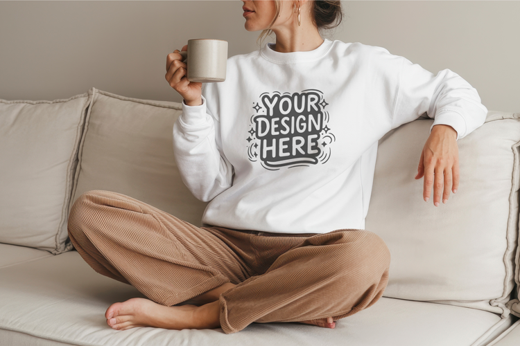 Fashion Lifestyle Women Apparel Coffee Cup Sweatshirt Mockup Home Scene Cozy Outfit Cotton Sweatshirt Comfy Wear